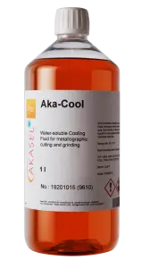 For the best performance of the cut-off wheel we recommend that you use Aka-Cool, a water-soluble coolant. This coolant ensures that the abrasives used in the cut-off wheels are properly lubricated where the cutting takes place. This means minimum thermal damage of both sample and cut-off wheel and therefore additional lifetime of the cutting wheels. It further protects the cutting machine from corrosion and helps to reduce clogging of the debris in the recirculating cooling unit, thus facilitating cleaning of the tank. 3 – 5% of Aka-Cool is mixed with water for optimum performance. This makes the final liquid a water-based cutting coolant.