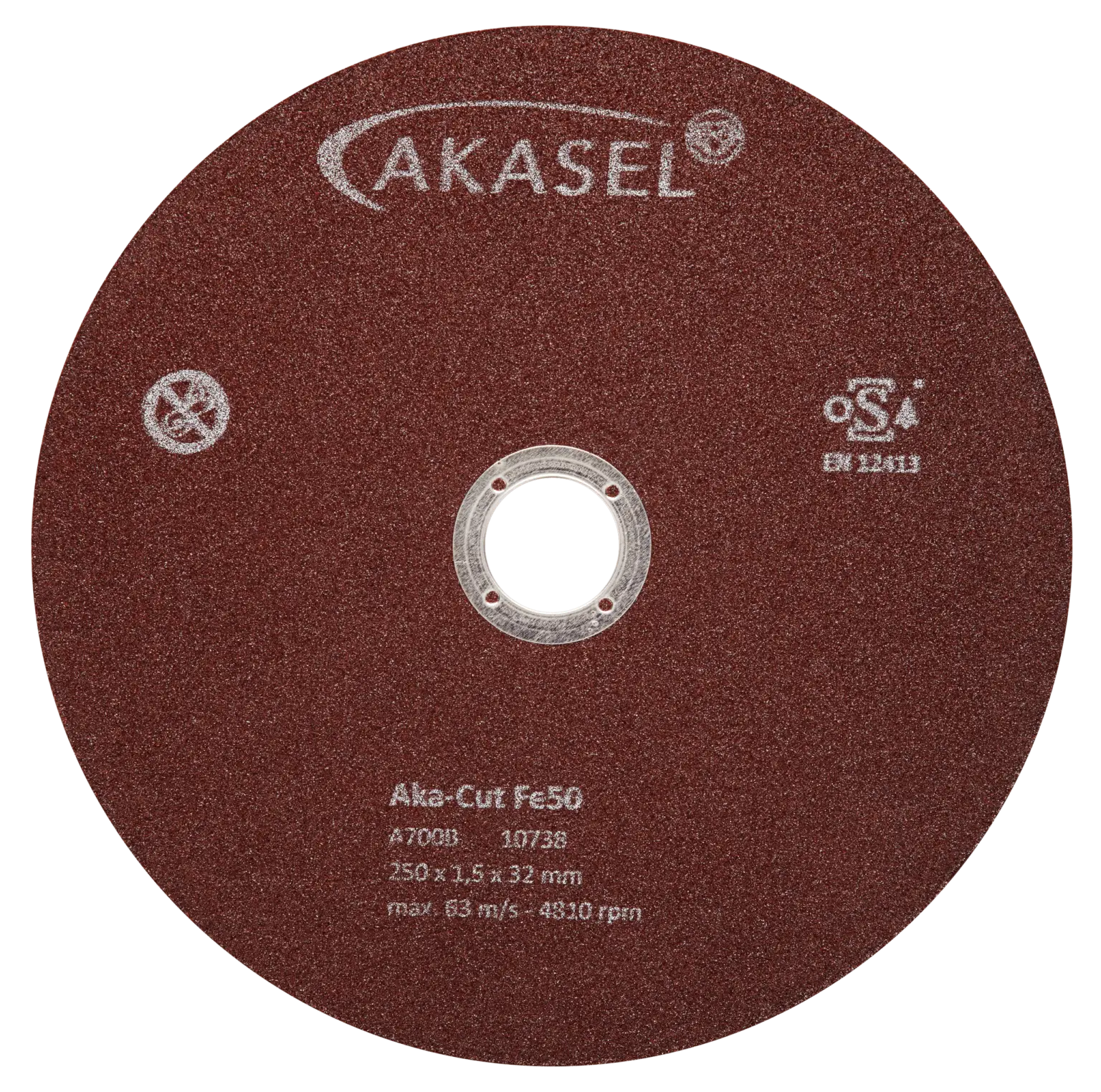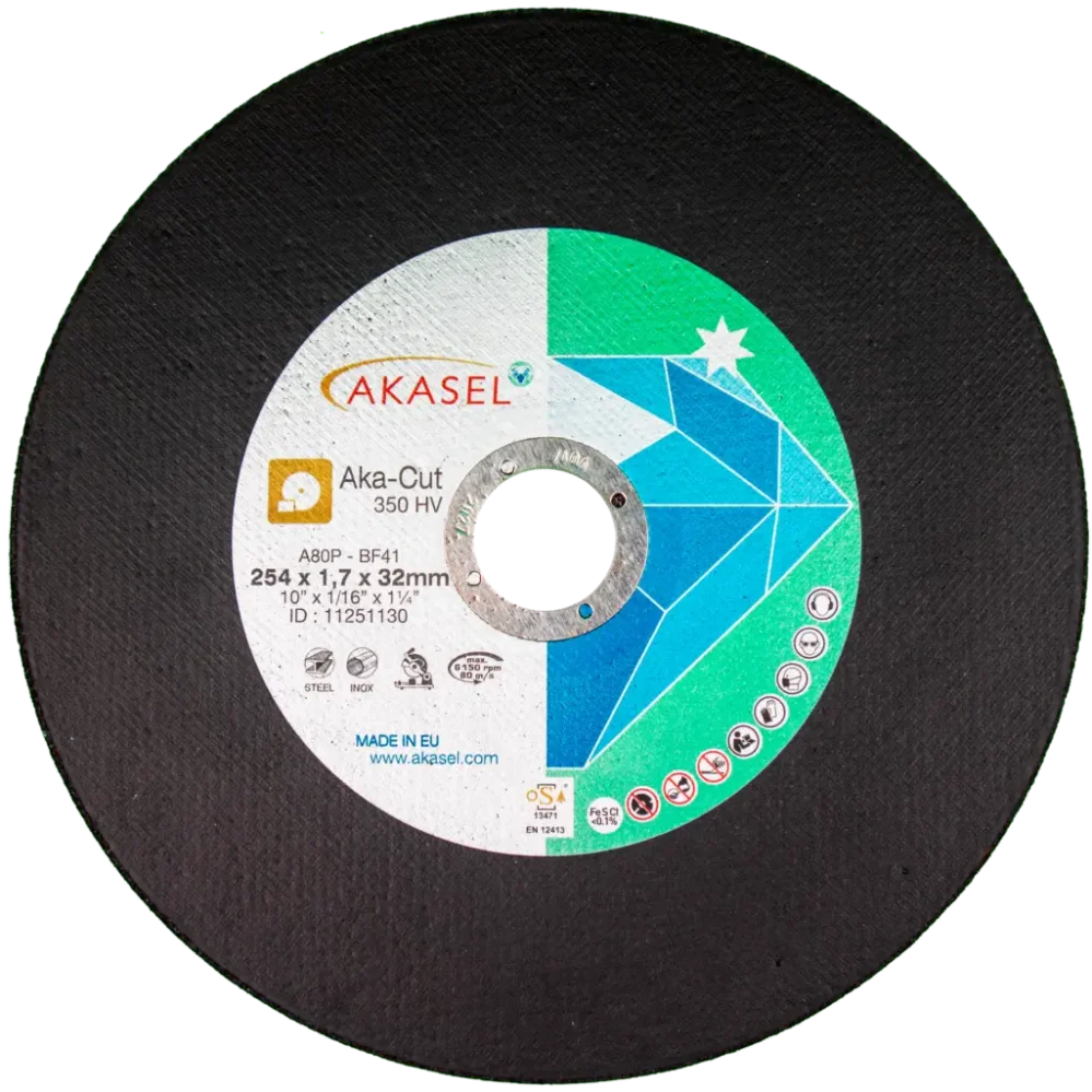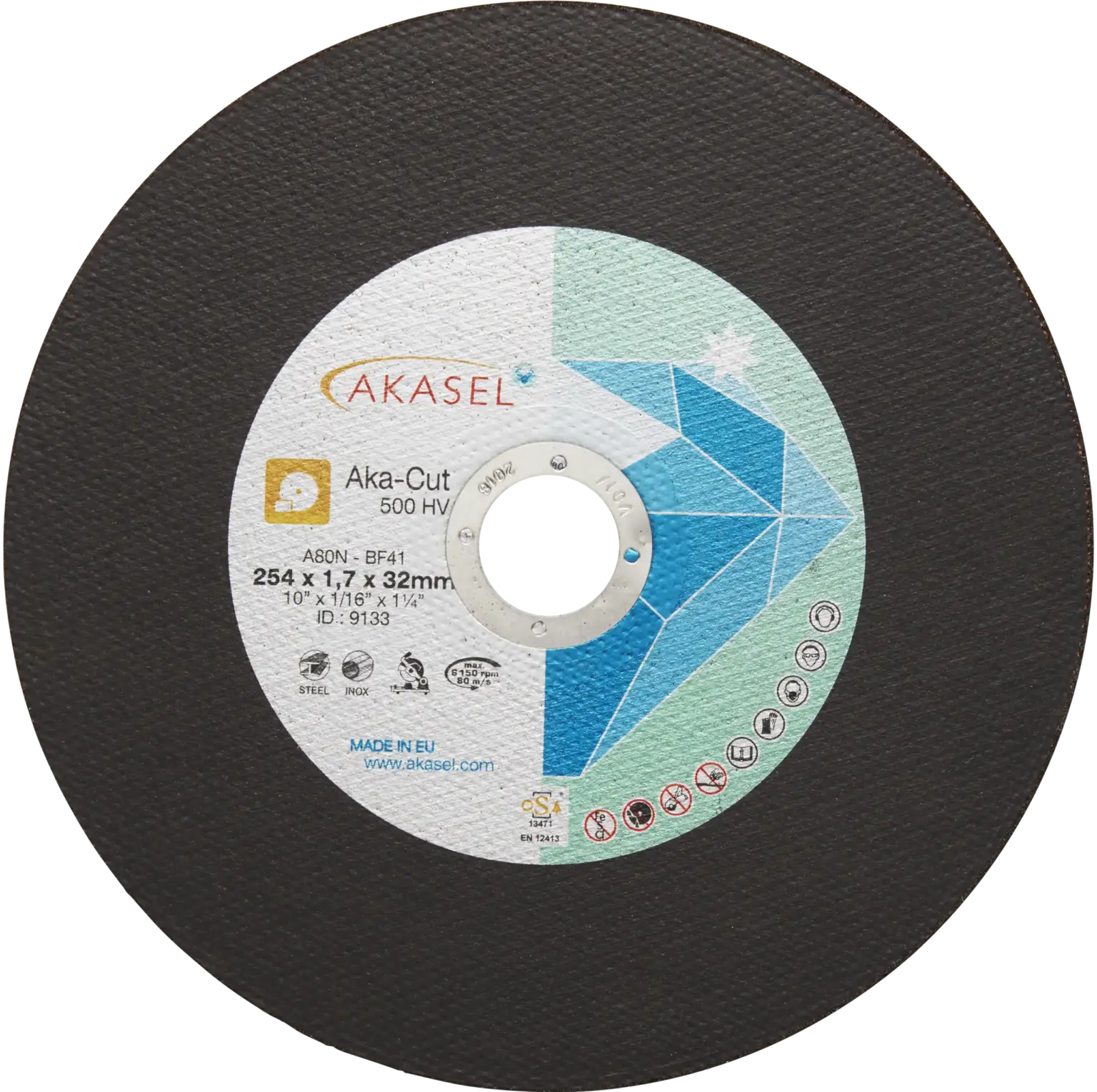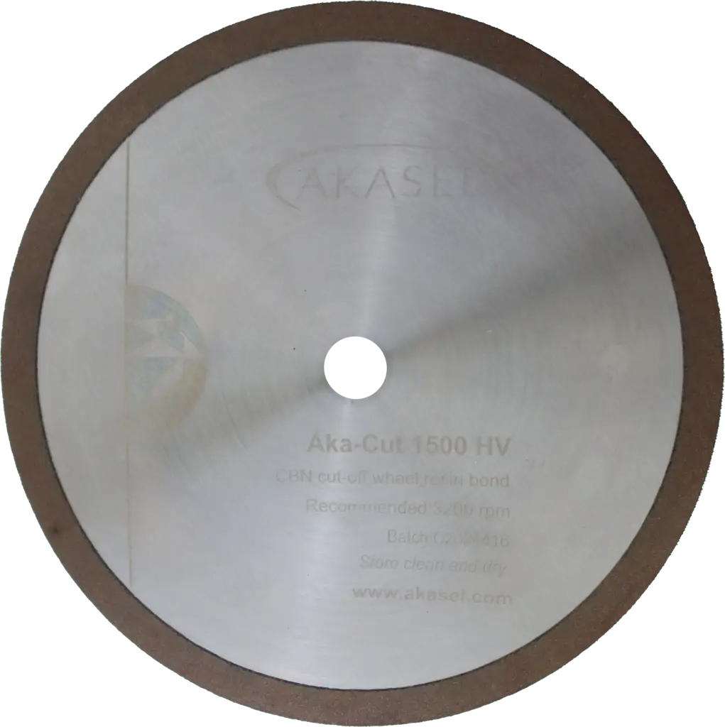 Aka-Cut 1500 HV is a resin bond CBN cut-off wheel for cutting very hard ferrous metals with a hardness of 700-1500 HV.