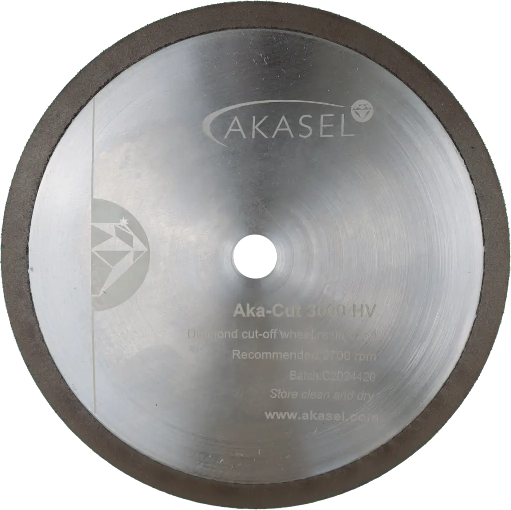 Aka-Cut 3000 HV is a resin bond diamond cut-off wheel. It is recommended for cutting very hard ceramics like oxides, carbides, nitrides and borides and materials containing large amounts of ceramic in a metal matrix like sintered carbides and powder metallurgy with a hardness above 1500 HV.