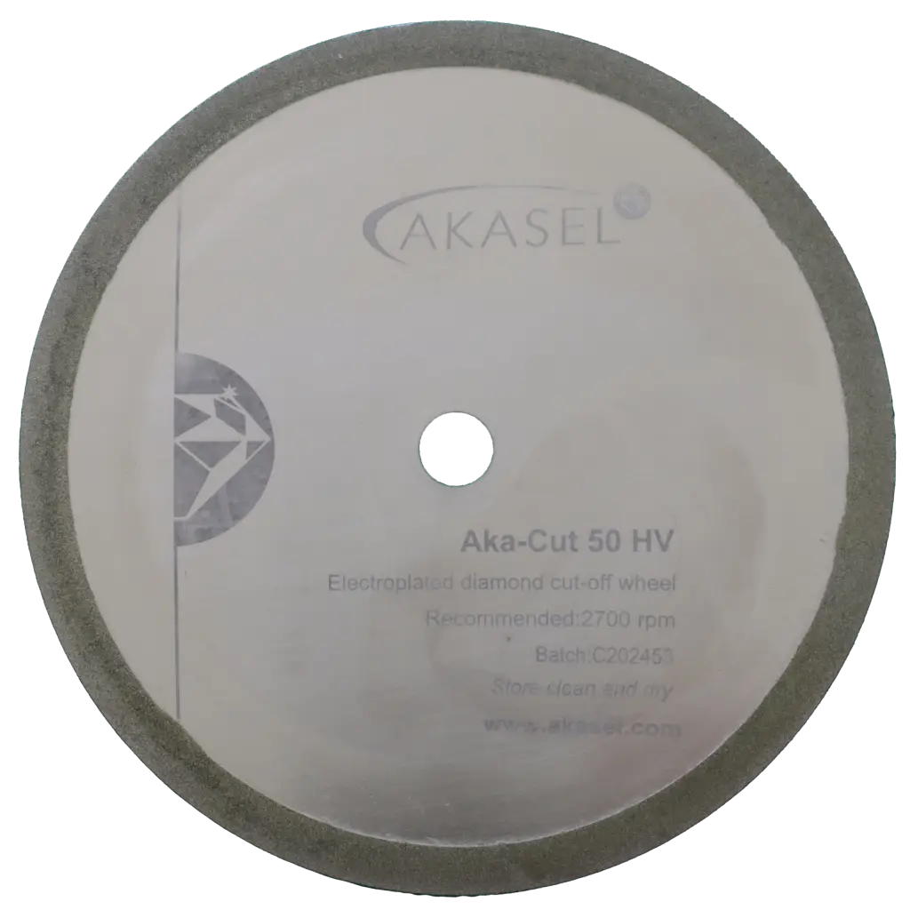 Aka-Cut 50 HV is an electroplated diamond cut-off wheel that is used for soft materials like resin or plastic, e.g. electronic components.