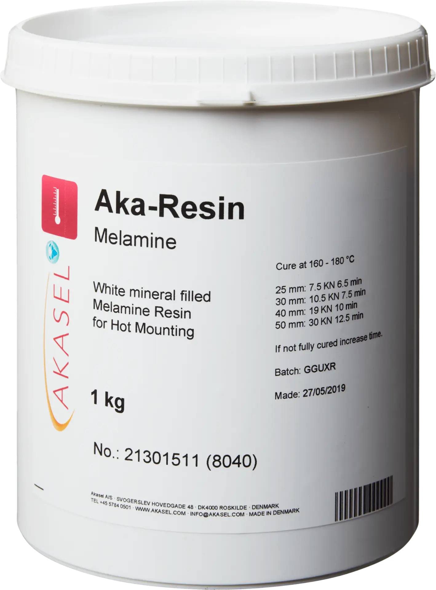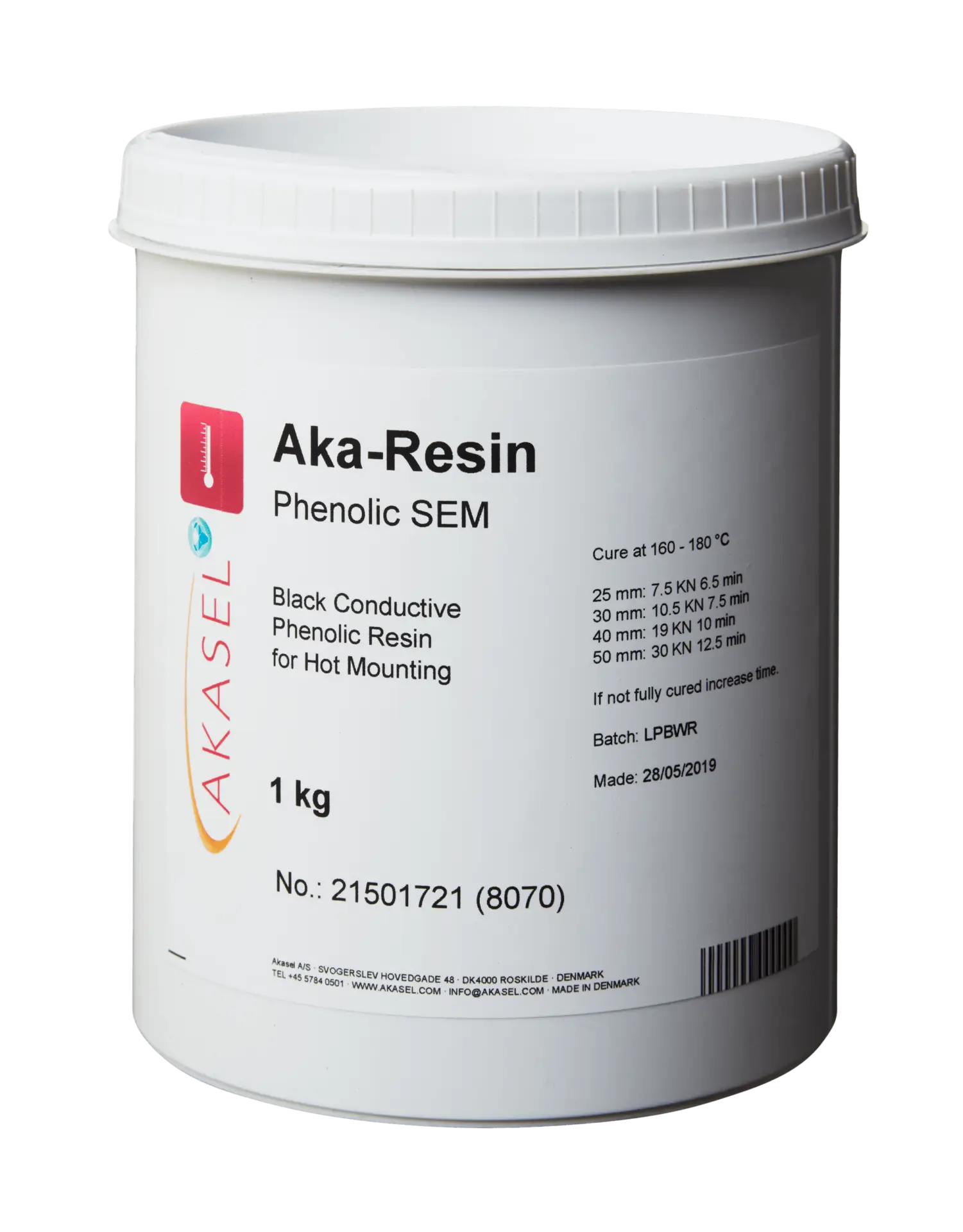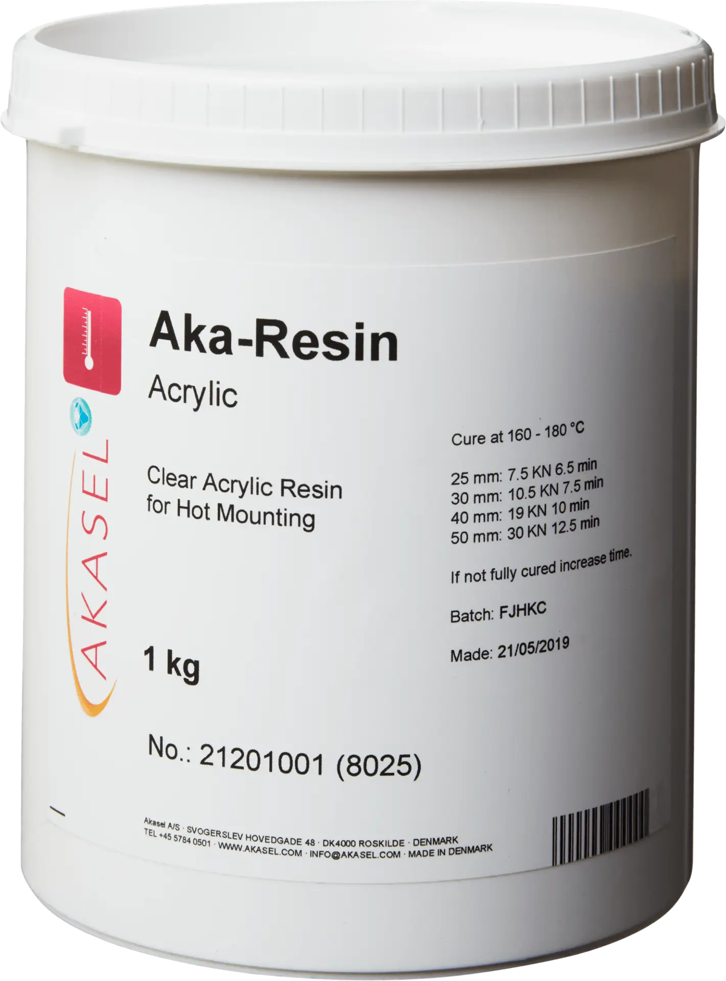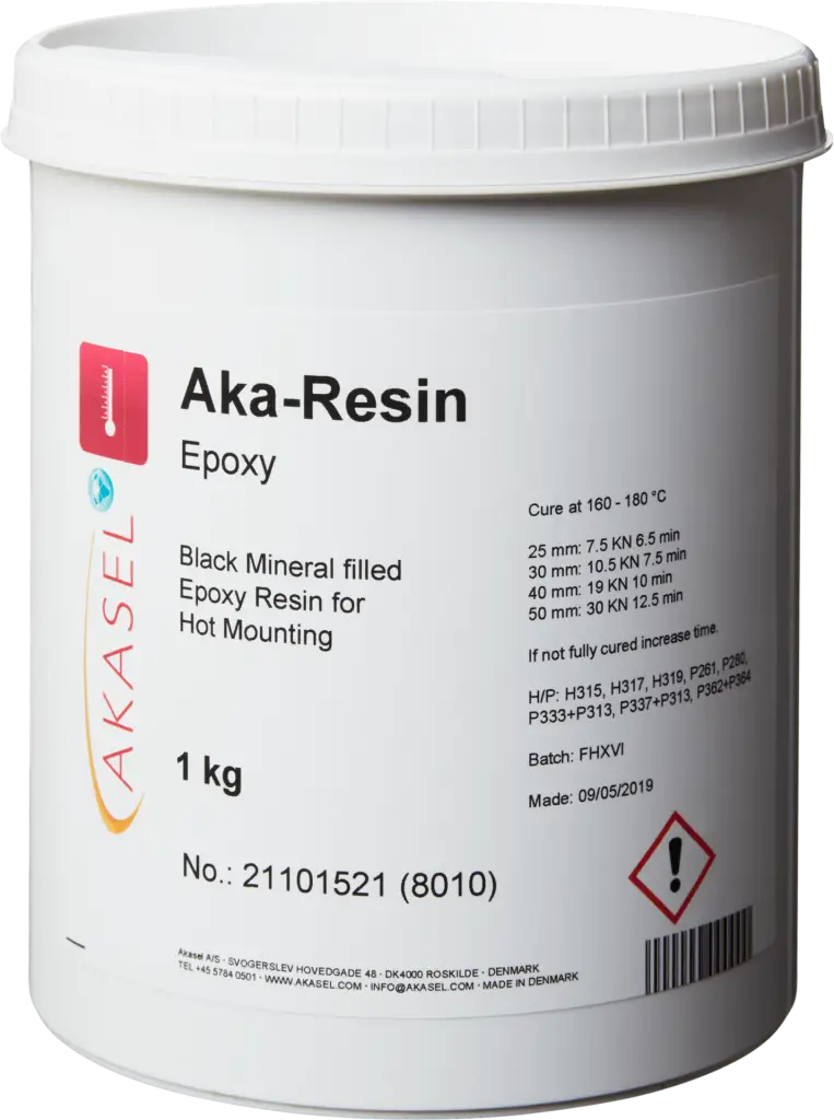 Hot mounting provides protection and support of the sample surface, makes it easier to handle the sample, allows for several small samples in one mount and gives uniform sizes for clamping in a sample holder. Hot mounting resins are to be used in a mounting press, where they are processed at high pressure and temperature to very uniform mounts ideal for examination in upright microscopes or other devices requiring specific sizes or shapes. Depending on your requirements, several different hot mounting compounds are available for your hot mounting process: