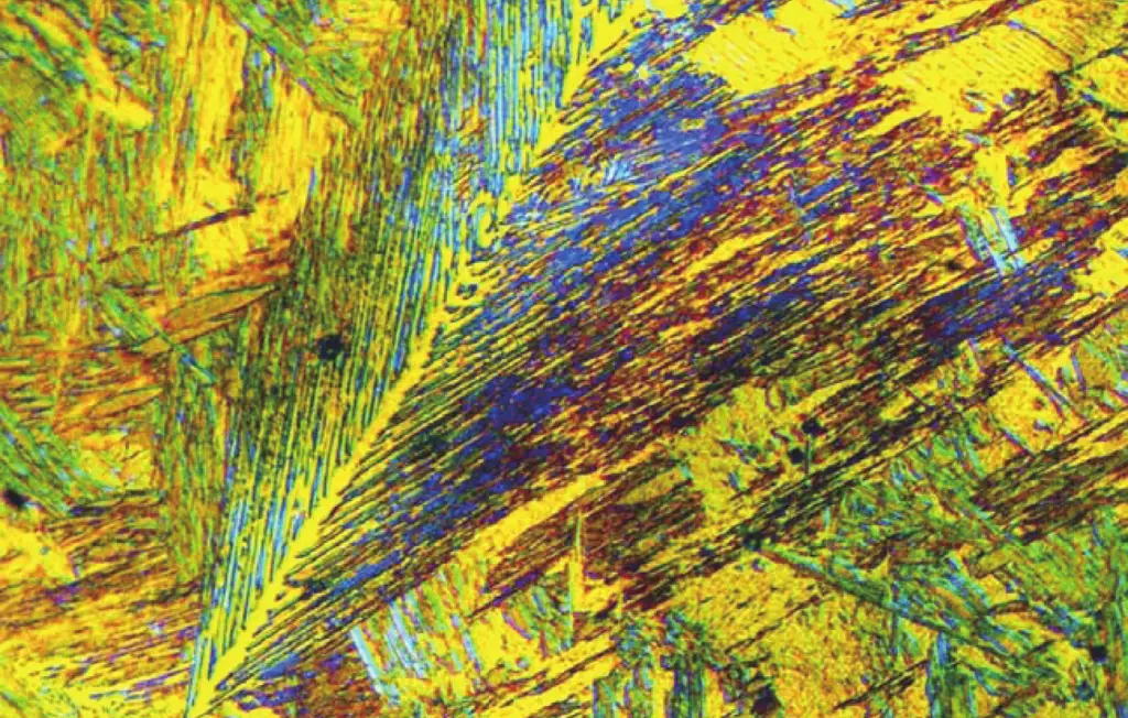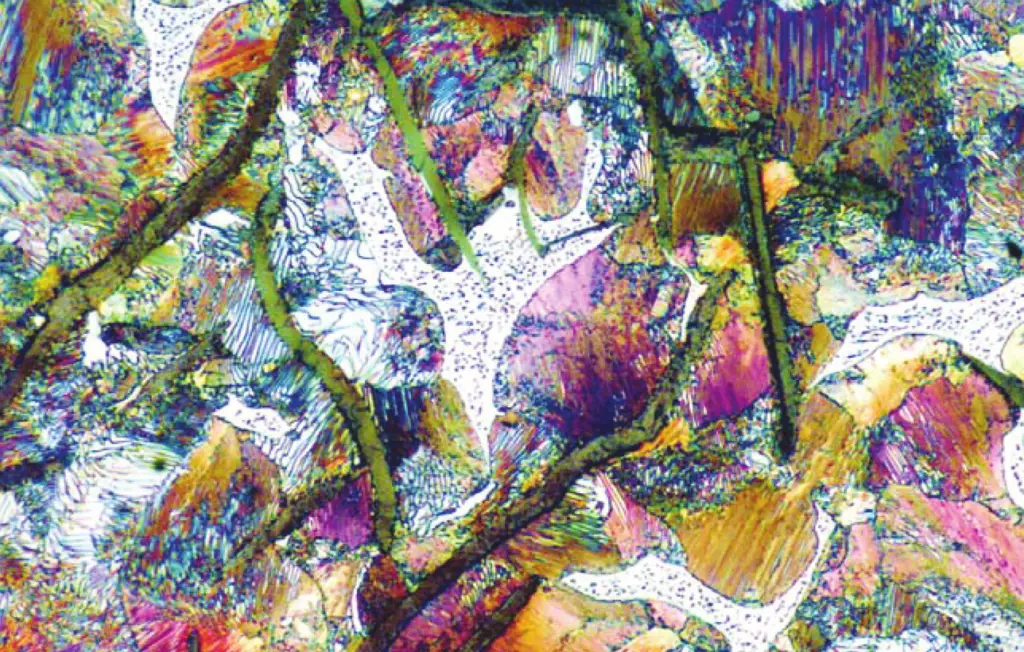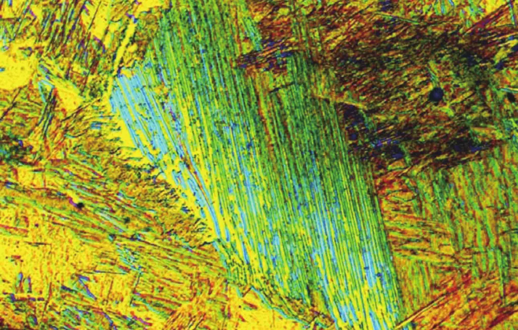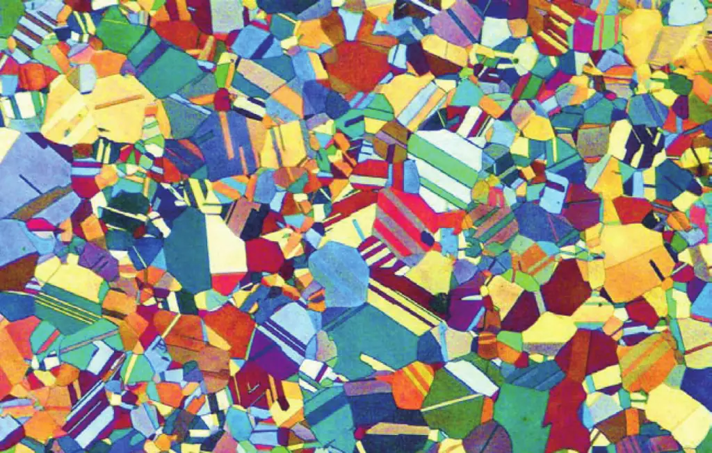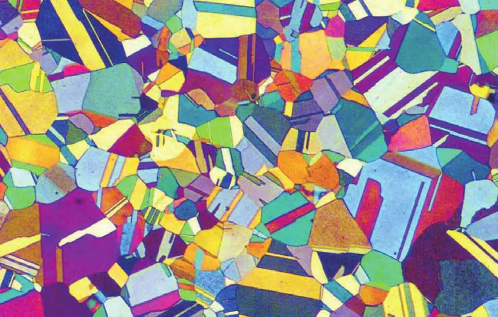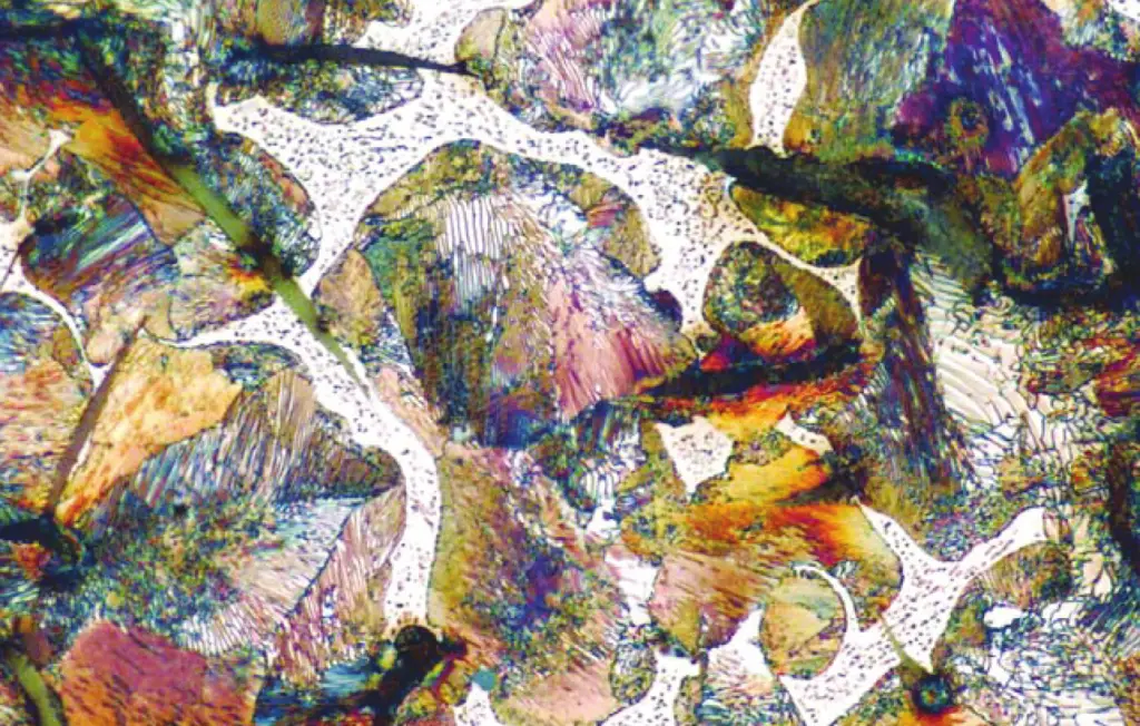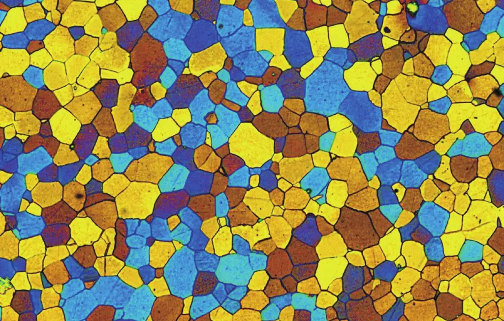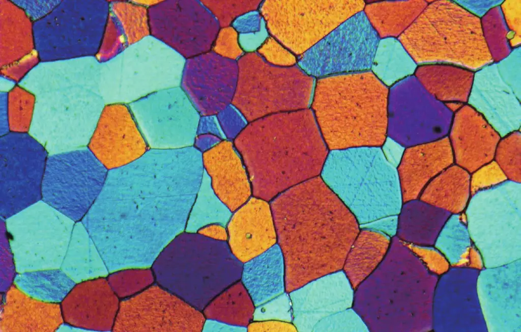Tissue description: Ferrite. After oxidation and coloring, ferrite grains with different orientations show different colors.